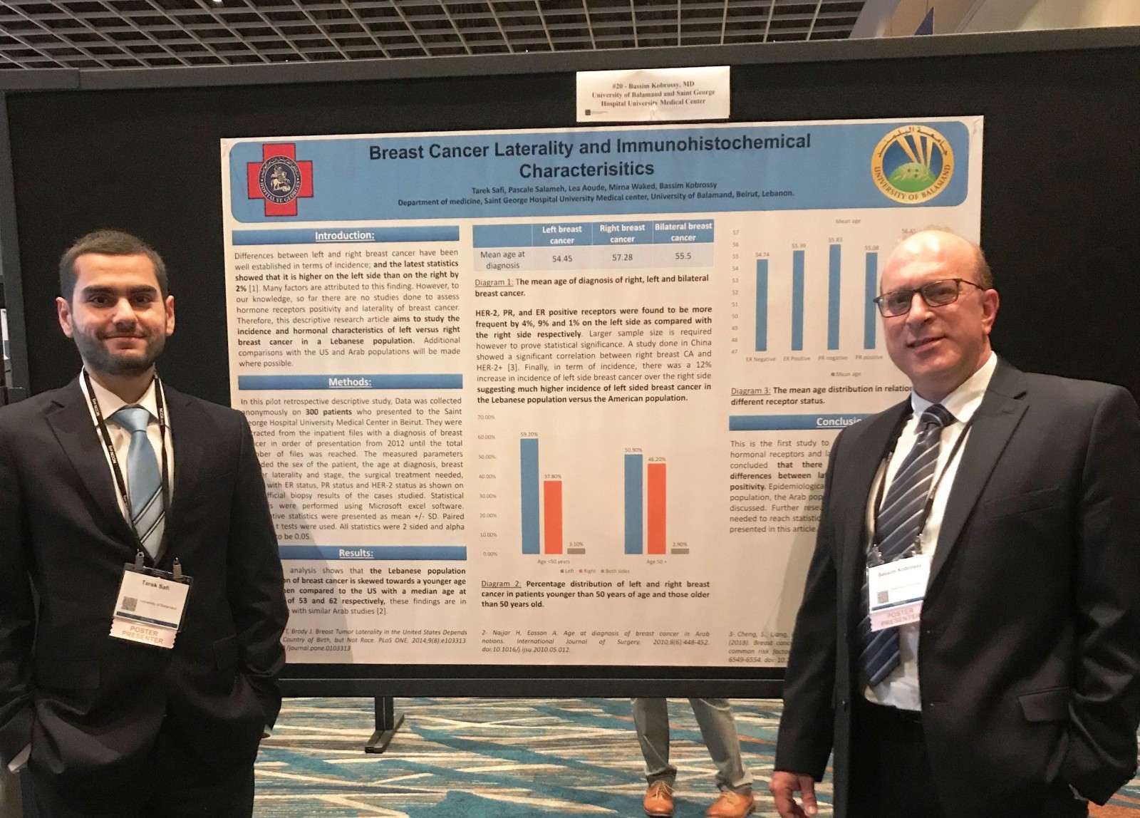 Dr. Bassim Kobrossy, Oncologist at Saint George Hospital and Tarek Safi, medical student in his last year of studies at the University of Balamand, were selected by the National Comprehensive Cancer Network (NCCN) @ https://www.nccn.org/ to present their research on “Breast Cancer Laterality and Immunohistochemical Characterisitics”. Tarek is the main author of the project. They both presented their poster during the annual global conference held in Orlando, Florida, March 21-23, 2019. The research mainly focuses on the differences between right and left breast cancer in term of incidence and immunohistochemical characteristics in a sample population taken from Saint George Hospital, Beirut.