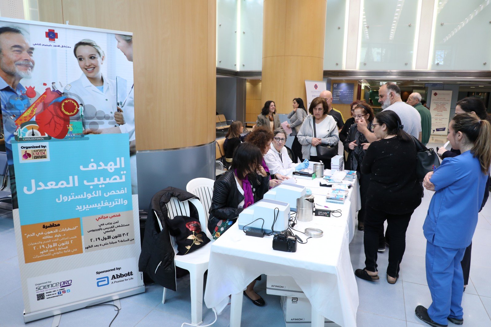 A 2 day awareness building campaign on Dyslipidemia organized by the Lebanese Society of Endocrinology Diabetes and Lipids through Science Pro and sponsored by Abott started today. In addition to customer education on the prevention of dyslipidemia, free testing for cholesterol and triglyceride is being offered in the hospital lobby until tomorrow 5:00 pm. Dr. Paula Atallah, Endocrinologist at SGHUMC & President of the Lebanese Society of Endocrinology, Diabetes and Lipids, offered on this occasion a scientific lecture at the Batlouni Auditorium to the hospital medical and paramedical staff.