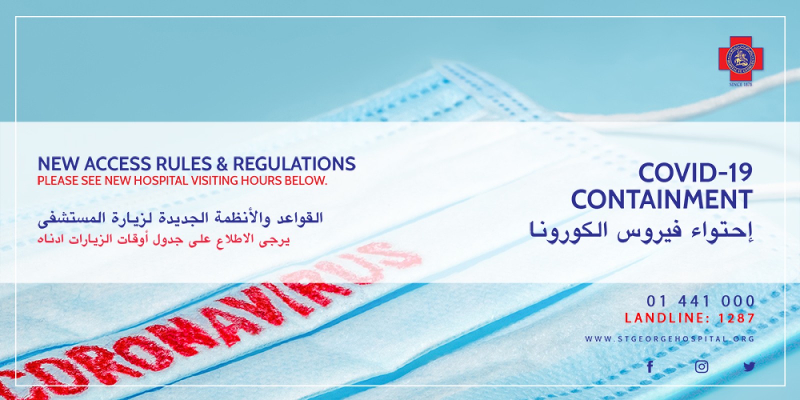 إن مستشفى القديس جاورجيوس الجامعي في بيروت وحرصاً منه على سلامة المرضى والعاملين فيه خاصة في هذه المرحلة الدقيقة لتفشي فيروس الكورونا ، وعملاً بمقررات وتعاميم الجهات الرسمية والصحية في الدولة اللبنانية ، تطلب ادارة المستشفى من جميع الزوار التخفيف من زيارة المرضى والاكتفاء بزائر واحد لكل مريض، والتقيد بالمواعيد المدرجة ادناه .