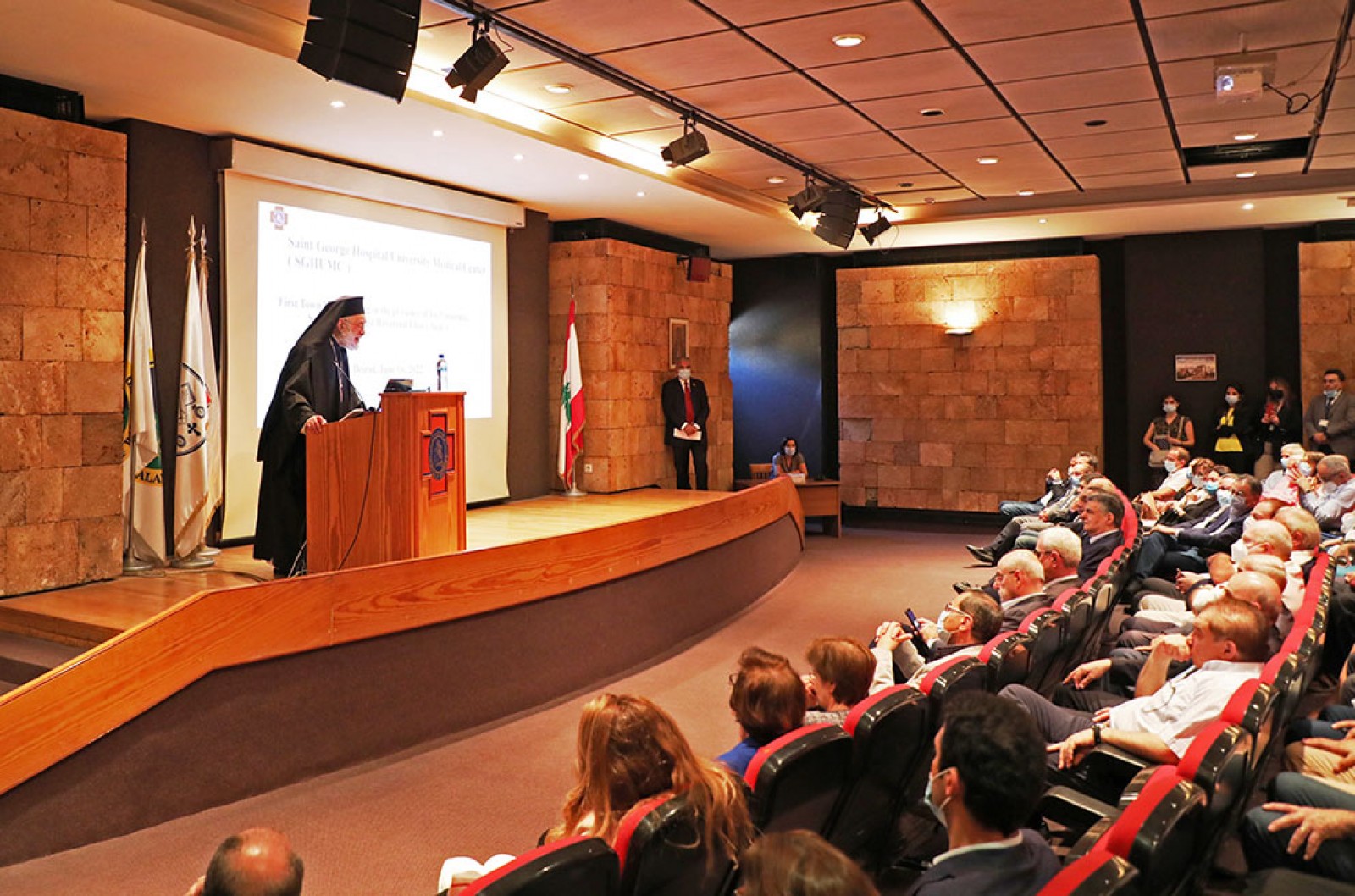 برعاية وحضور سيادة متروبوليت بيروت وتوابعها المطران الياس الجزيل الإحترام وبمناسبة تسلّم المدير الجديد لمستشفى القديس جاورجيوس الجامعي د. مروان نجار مهامه جرى صباح اليوم الخميس 16 حزيران 2022 في مستشفى القديس جاورجيوس الجامعي لقاء عام للأطباء والممرضات والممرضين وجميع العاملين في المستشفى. وقد حضر الإحتفال أعضاء مجلس إدارة المستشفى، رئيس جامعة القديس جاورجيوس د. طارق متري، والعمداء فيها، المدير السابق للمستشفى السيد إدغار جوجو والمدير الطبي د. إسكندر نعمه.