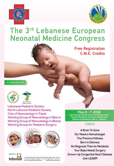 The Neonatology Division and Pediatric Department at Saint George Hospital University Medical Center in collaboration with the Faculty of Medicine at the University of Balamand are proud to announce the Third Lebanese European Neonatal Medicine Congress which will be held on May 6 and 7, 2016.