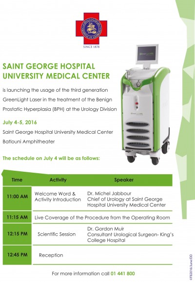 Saint George Hospital University Medical Center is launching the usage of the third generation GreenLight Laser in the treatment of the Benign Prostatic Hyperplasia (BPH) at the Urology Division